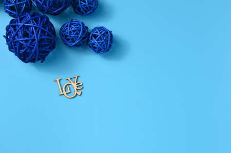 Blue decorative balls on a blue background. The inscription Love on a blue background