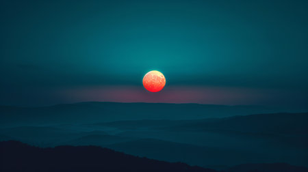This image features a detailed mountain range silhouetted against a vibrant, glowing celestial body. The composition uses contrasting colors, a gradient effect, and a dark background creating a sense of wonder. Ideal for various commercial and editorial projects requiring a visual of nature and space.