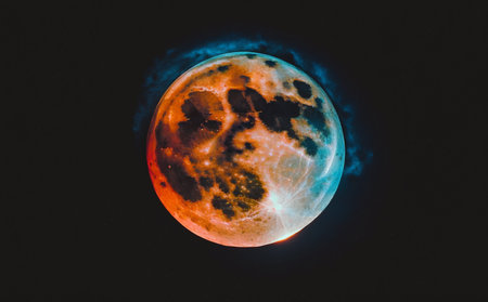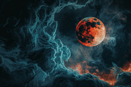 An image captures a celestial scene featuring a prominent red moon. Dark clouds envelope the moon with a dramatic effect. The overall color palette is dominated by deep blues and reds. Suitable for use in various creative and design projects, the image conveys a sense of mystery and cosmic beauty.