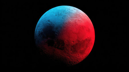An isolated, spherical celestial body displays a split color scheme of red and blue. The smooth surface contrasts against the dark void. This digitally rendered image could be used for various projects. Its simplistic composition offers adaptability for design and visual communication purposes.