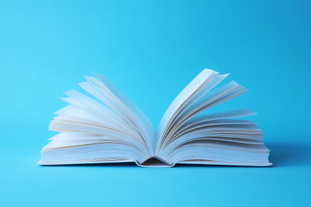 An open book on a bright blue background