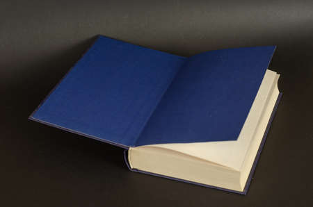 Open book on a black background. Textbook with blue endpapers. Hardcover. Knowledge, reading. Selective focus.