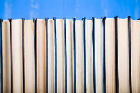 Stack of books on a blue background. A lot of books are close-up.