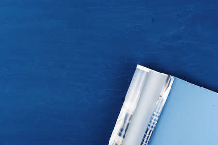Top view of open magazine page with copy space on classic blue background