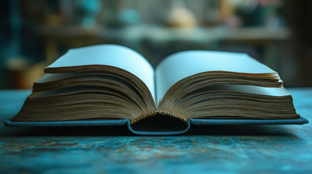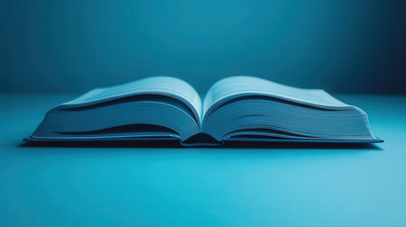 A large single book sitting with pages open on a desk and blue background
