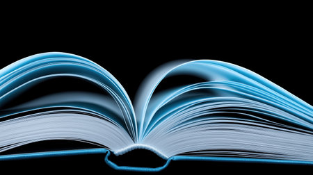 Open book with glowing blue light trails on black background. Future of knowledge concept