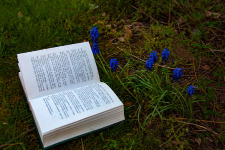 Book on the green grass surounded by by blue spring flowers