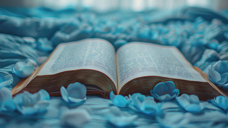 An open book resting on a neatly made bed, with crisp pages and a soft cover.