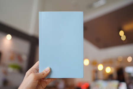 Woman hand holding a light blue book with blank cover for inserting text on blurred cafe background.