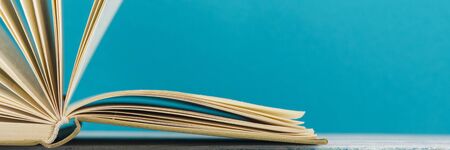 Open book on blue background with copy space. Back to school concept.