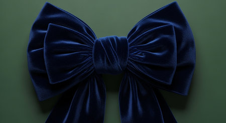 A close-up of a luxurious deep blue velvet bow with soft folds against a dark green background.
