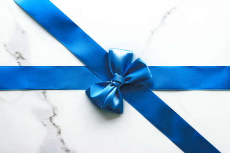 Happy holidays, festive decoration and brand sale promotion concept - Blue silk ribbon and bow on luxury marble background, holiday flatlay backdrop