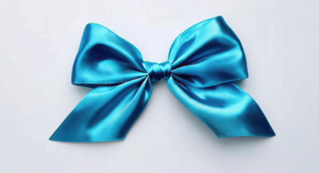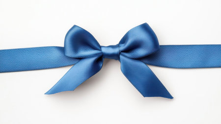 A beautiful blue satin ribbon bow gracefully tied on a bright white background, perfect for gift wrapping, decorative projects, and special occasions.