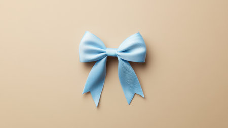 A charming light blue ribbon bow gracefully placed on a smooth beige background, perfect for various gift wrapping, crafting projects, or decoration needs.