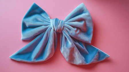 This image features a soft blue velvet bow beautifully laid against a pink background. It captures a trendy and delicate accessory ideal for fashion or decorative uses.