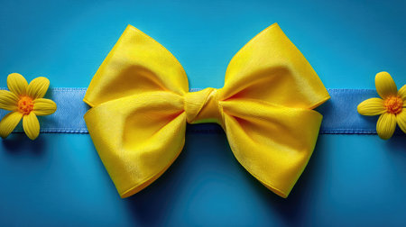 This image showcases a bright yellow bow accompanied by a blue ribbon and yellow flowers on a vibrant blue background. Ideal for festive decorations.
