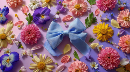 A beautiful blue satin bow is elegantly placed on soft fabric, accompanied by delicate floral elements in the background. Perfect for decorative purposes.