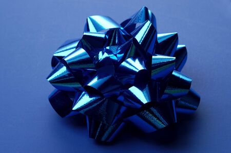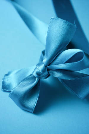 Blue bow gift ribbon, close up. Top view. Copyspace.