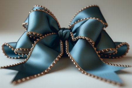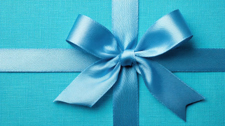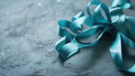 A close-up captures a teal ribbon bow elegantly adorning a gift box. The composition emphasizes the bow's texture and form against a neutral background. Warm lighting enhances the object's presentation. Suitable for various projects needing elements of celebration, gifting, or special occasions.