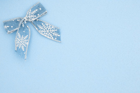 Blue bow with white snowflake on blue felt with textured material background with copy space for your present or gift message