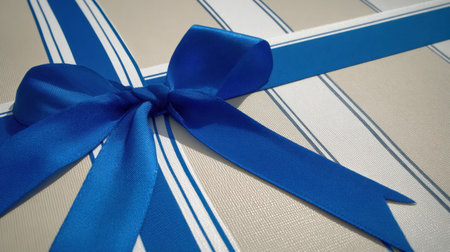 A stunning close-up of an elegant blue ribbon tied in a flawless bow on a finely striped gift box. Perfect for illustrating celebrations and special occasions.