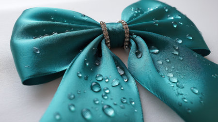 A stunning teal satin bow adorned with sparkling accents and delicate water drops creates a luxurious focal point for weddings and special occasions.