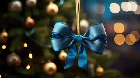 Close-up of a Christmas tree decoration. Blue bow on a branch.
