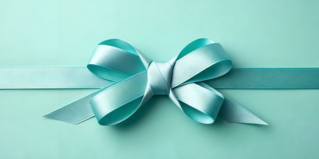 Beautiful satin ribbon in Tiffany blue color expertly formed into symmetrical bow resting centered on matching light cyan background symbolizing celebration gift packaging and luxurious presentation element