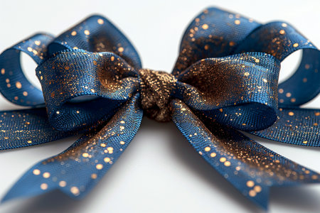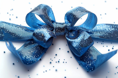 A beautiful blue bow adorned with shimmering glitter and scattered confetti, set against a clean white background. Perfect for festive occasions.