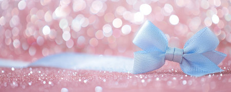 A delicate baby blue ribbon bow on a pink glitter background. The soft, pastel colors and shimmering texture create a sweet and charming look.