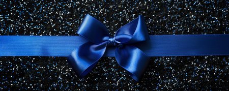 A vibrant cobalt blue ribbon bow on a black glitter background. The bold color and sparkling texture create a striking and modern look.