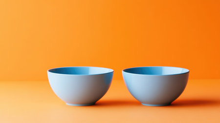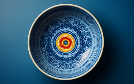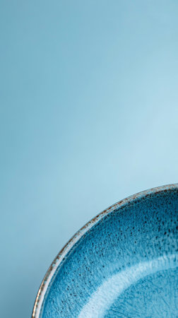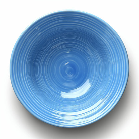 A blue ceramic bowl is shown from a top perspective, smooth and round