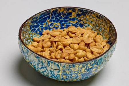 A blue ceramic mattle deep bowl for breakfast flying on blue background. Ideal photo for levitation of food and fruits or nuts.