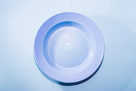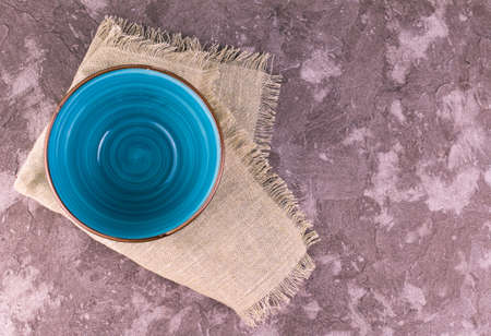 Empty plastic blue-gray salad bowl on the rustic table, top view