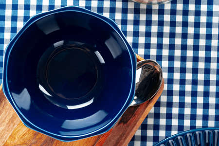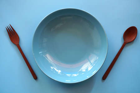 Empty ceramic blue bowl with wooden fork and spoon put on wooden table