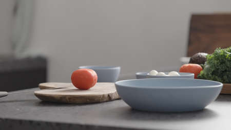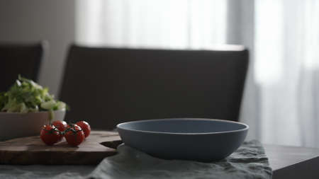 Making salad with cherry tomatoes and mixed greens in blue bowl on wood table