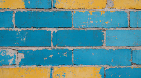 A vibrant wall features alternating blue and yellow bricks, showing their weathered textures and peeling paint. This urban backdrop adds character and a pop of color to the environment.