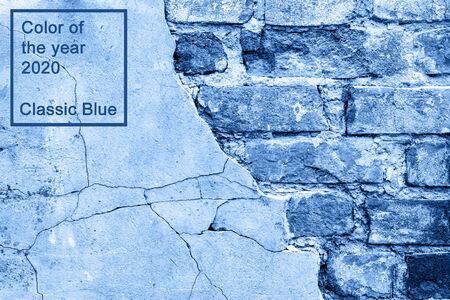 Weathered texture of racked concrete vintage brick wall background, stained old dark brown and red brick wall background, grungy rusty, in classic blue trendy color. Color of the year 2020.