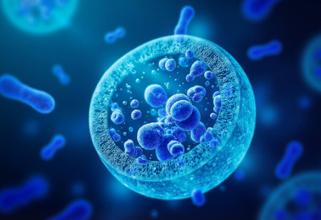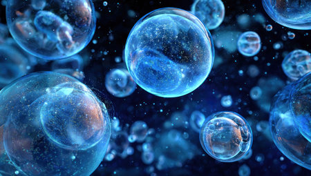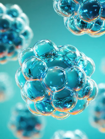 Close-up of round, translucent structures with interior details, blue tones, suggesting cell-like formations