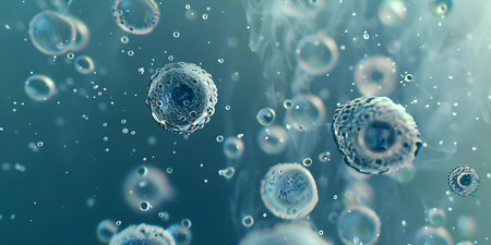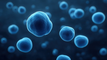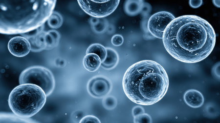 Many cells float against a dark blue backdrop, illustrating the complexity of biological structures and the intricate world of cellular life in a laboratory.