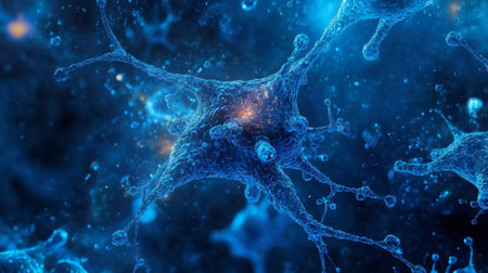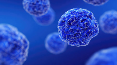 Abstract visualization of blue microorganisms in space, showcasing intricate cellular structures. Ideal for educational, scientific, and healthcare-themed projects.