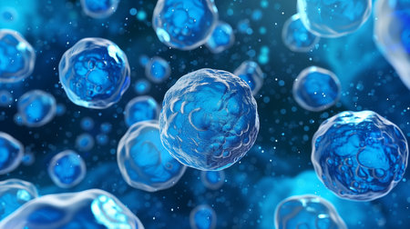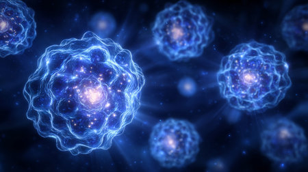 Vibrant pluripotent stem cells float in a rich blue setting, symbolizing regeneration