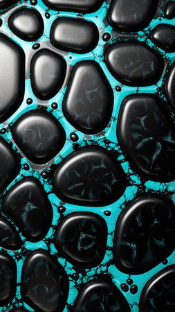 An abstract arrangement of smooth, reflective black shapes resembling pebbles, set against a vibrant turquoise background. The dark forms have a glossy appearance, contrasting with the textured, slightly cracked surface of the blue spaces. This creates a dynamic and modern pattern.
