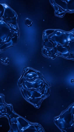 Abstract dark blue liquid blobs with a glossy sheen float in a deep cosmic space filled with tiny glowing stars creating a mysterious and fluid visual.