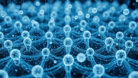 Communication showing intricate network of glowing blue spheres and interconnected lines representing a digital data structure or molecular network in a dark...