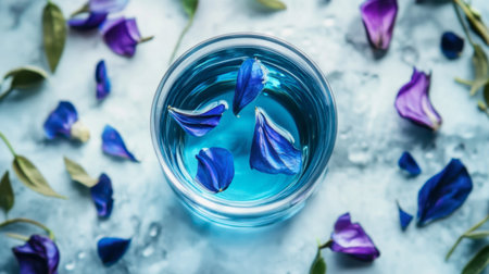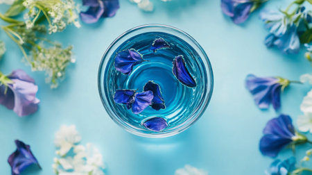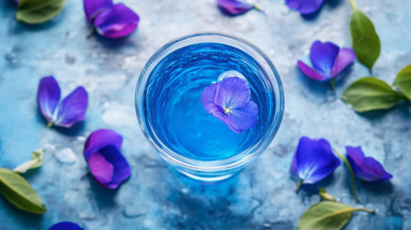 A captivating blue drink rests in a glass, surrounded by beautiful purple flower petals, creating a serene and artistic display perfect for relaxation and enjoyment.