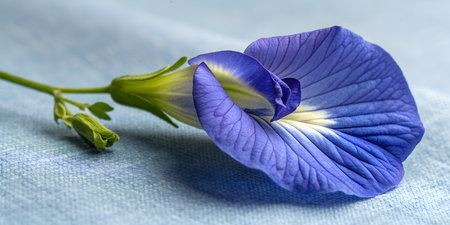 Vibrant blue tropical flower close up image showing distinct shape butterfly pea bright purple coloration white yellow center natural herbal tea ingredient widely used traditional medicine single flower bud visible resting softly textured fabric background fresh natural beauty