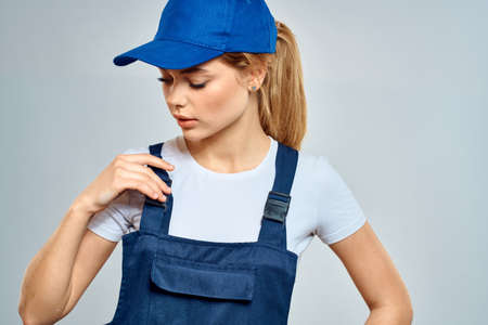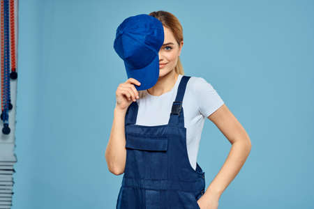 Woman in work uniform blue cap carriage delivery service courier blue background