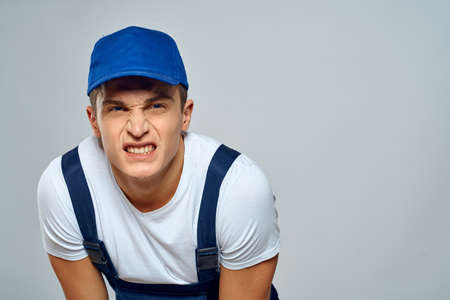 Worker man uniform delivery service emotions studio light background