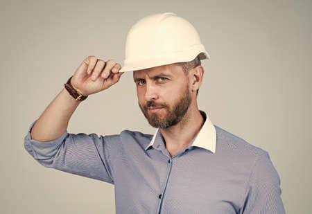 handsome smiling bearded businessman in helmet, business engineer